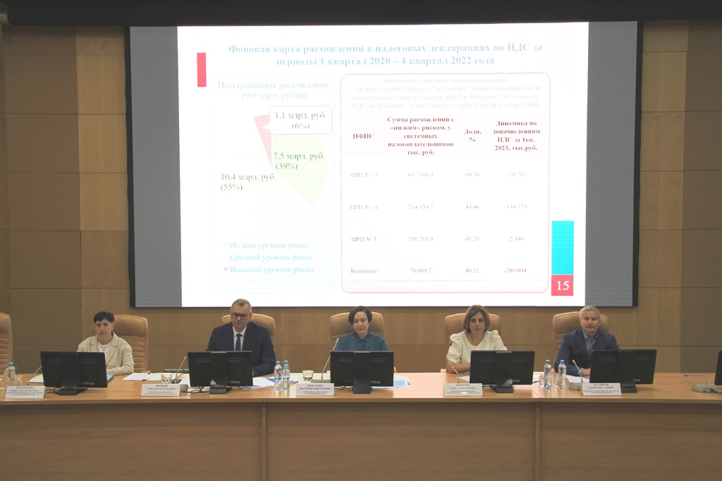 27 июня в подмосковном налоговом управлении под председательством руководителя УФНС России по Московской области Екатерины Макаровой прошло очередное заседание коллегии. В мероприятии приняли участие заместители руководителя и начальники отделов управления, начальники и заместители начальников налоговых инспекций региона. Участники коллегии подвели промежуточные итоги работы налоговых органов региона по камеральному контролю и администрированию налога на добавленную стоимость, определили резервы по данному направлению деятельности и обсудили результаты реализации проекта по развитию доходного потенциала региона. В своем выступлении начальник отдела камерального контроля управления Елена Ковалькова сообщила, что в результате мероприятий налогового контроля в рамках камеральных налоговых проверок, в том числе путем адресной работы с налогоплательщиками, направленной на побуждение к самостоятельной корректировке налоговых обязательств, в целом по региону достигнут значительный рост показателей контрольно-аналитической работы. Так, в результате представления налогоплательщиками уточненных налоговых деклараций по УСН сумма дополнительно уплаченных налогов за 2022 год составила 124 млн рублей, что в два раза превышает аналогичный показатель 2021 года. Елена Ковалькова отметила, что количество деклараций по НДС, представленных в Московской области за 1 квартал 2023 года, составило более 65 тысяч. При этом, доля «нулевых деклараций» по НДС в общем количестве на 01.06.2023 составила 27,5% (на 4,3 пункта ниже значения по Российской Федерации), что также свидетельствует и о повышении налоговой дисциплины среди налогоплательщиков, и об эффективной работе налоговых органов региона, направленной на сокращение доли теневого сектора экономики, создание «чистой», конкурентной налоговой среды. О работе контрольно-аналитических подразделений налоговых органов Московской области, задача которых посредством ПК «АСК НДС-2» выявить схемы уклонения от уплаты НДС и установить фактических выгодоприобретателей для принятия оперативных мер по пресечению незаконной налоговой оптимизации, доложила начальник контрольно-аналитического отдела управления Ирина Смолина . Она обратила внимание участников коллегии на то, что работа с системными выгодоприобретателями является действенным инструментом по снижению приоритетных рисков, в связи с чем необходимо обеспечить стопроцентный охват системных выгодоприобретателей результативными камеральными налоговыми проверками по текущим периодам. Ирина Смолина обобщила положительный опыт по данному направлению работы, дала оценку деятельности подмосковных налоговых инспекций, определила задачи по пресечению «схемных» и «сомнительных» операций по НДС. Об итогах контрольно-аналитической работы в рамках реализации проекта «Развитие доходного потенциала Московской области» рассказал начальник отдела налогообложения юридических лиц управления Виталий Пыркин . Оценивая динамику поступлений в консолидированный бюджет Московской области, Виталий Пыркин подчеркнул, что устойчивому росту доходов способствовала качественная аналитическая работа инспекций и органов государственной власти Московской области, проведенная с плательщиками в рамках проекта. Так, с момента его запуска в к