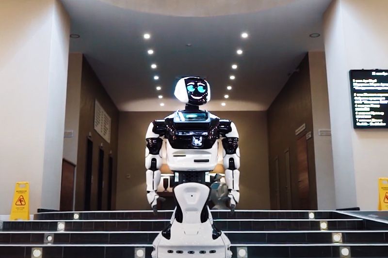 Андроид разработан российской компанией Promobot. В его оперативную память загружено более 100 вариантов типичных вопросов посетителей клиентского офиса и, соответственно, ответы на них.