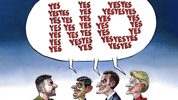 Красочная карикатура в британской The Times: на вопрос об истребителях из ответов "да-да" складывается большое "нет" от британского премьера Сунака, французкого президента Макрона и главы ЕС Урсулы фон дер Ляйен. И в подтверждении отказа в самолетах – яркая реплика от британского министра обороны Уоллеса: истребители по сложности он сравнил с болидами "Формулы-1", а т,о что дарили Зеленскому до этого, – с велосипедом: "Вы переходите от подарка велосипеда – имею в виду NLAW – к команде "Формулы-1". С гонщиком идет пит-команда. В команде "Формулы-1" без пит-команды вы не сможете завести машину, и она точно не сможет проехать больше восьми кругов. Если вы даете истребитель "Тайфун", вам придется дать целую кучу людей".