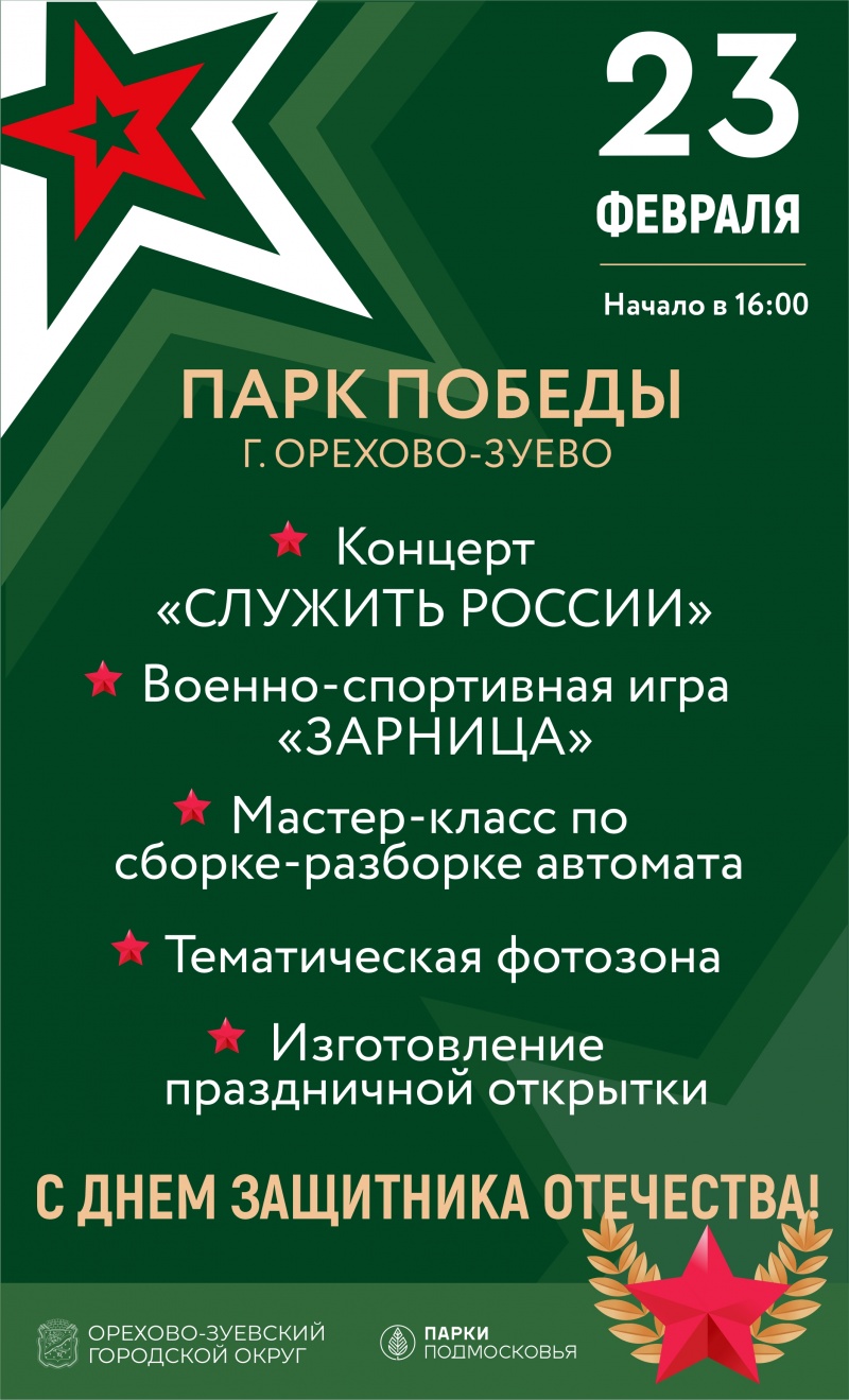 В этом году сразу 4 выходных — с 23 по 26 февраля. Проведите их с пользой! В эти дни вас ждет масса культурно-развлекательных мероприятий, которые пройдут по всему округу: концерты, квесты, мастер-классы. Все подробности в нашей афише.