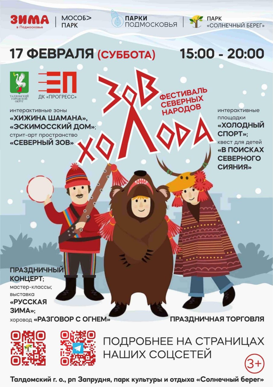 В этот же день в парке «Солнечный берег» п. Запрудня состоится уникальное мероприятие - фестиваль северных народов "Зов холода". Вас ждут катания на оленях, интерактивные зоны "Эскимосская иглу", "Хижина шамана", спортивные состязания, интерактивные программы, мастер-классы и многое другое. Начало в 15:00ч.