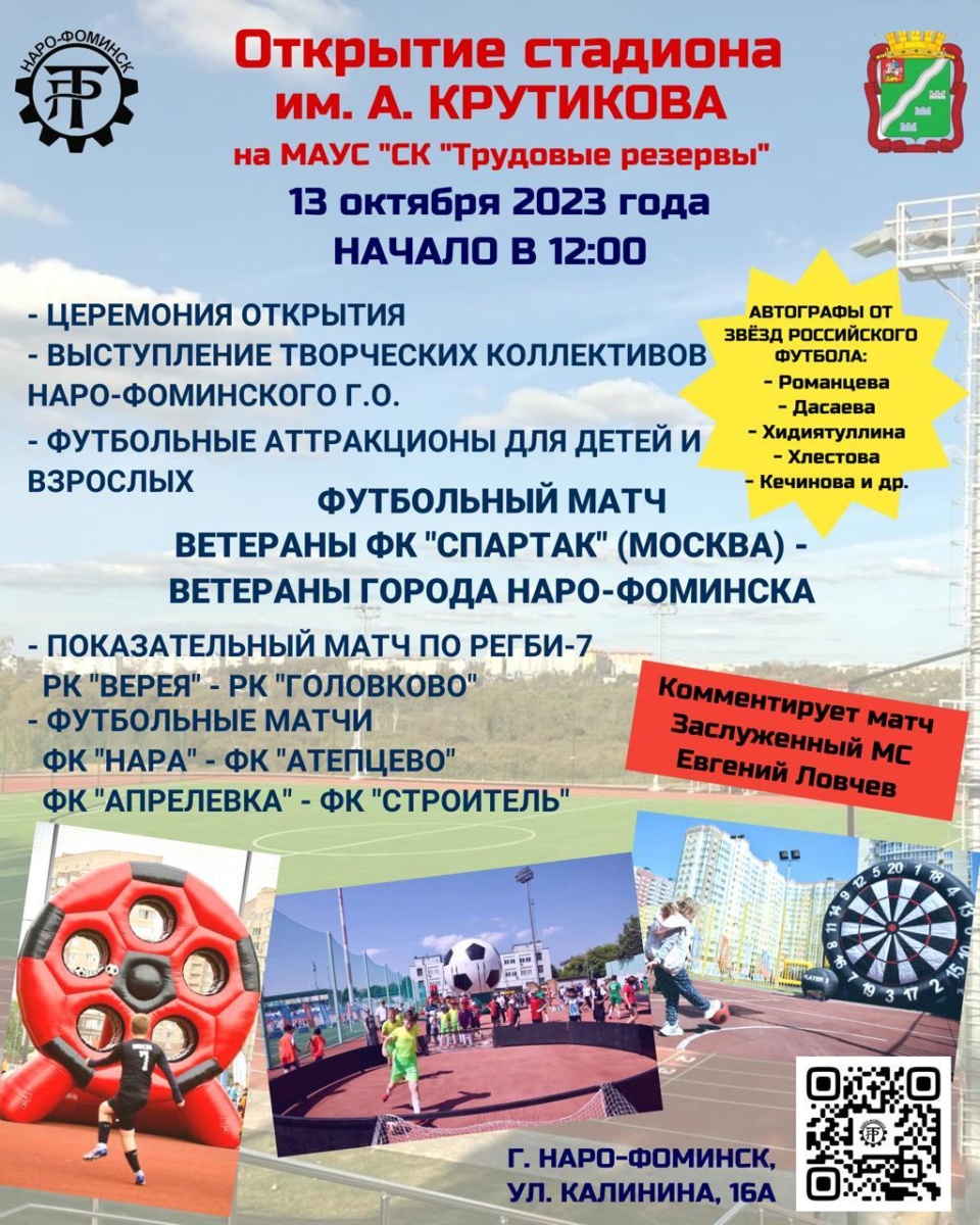 Пройдёт футбольный матч ветеранов ФК «Спартак» (Москва) и ветеранов города Наро-Фоминск, а также показательный матч от детско-юношеских команд по регби-7.
