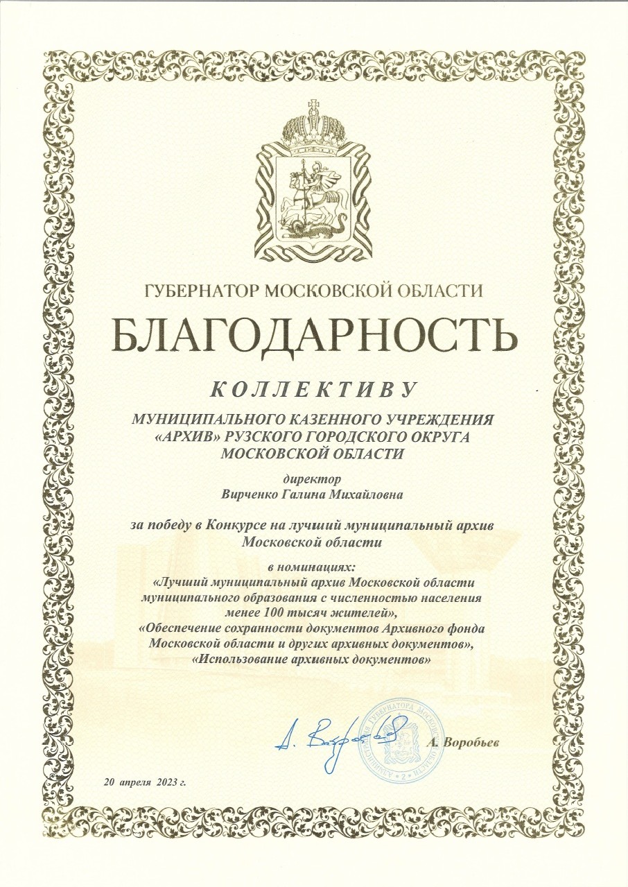 На Празднике труда, который проходил в Центре культуры и искусств города Руза, глава Рузского городского округа Николай Пархоменко вручил Благодарность губернатора Московской области коллективу муниципального казенного учреждения «Архив» за победу в областном конкурсе на лучший муниципальный архив в категории «Лучший муниципальный архив Московской области муниципального образования с численностью населения менее 100 тысяч жителей» и в номинациях «Обеспечение сохранности документов Архивного фонда Московской области и других архивных документов», «Использование архивных документов».