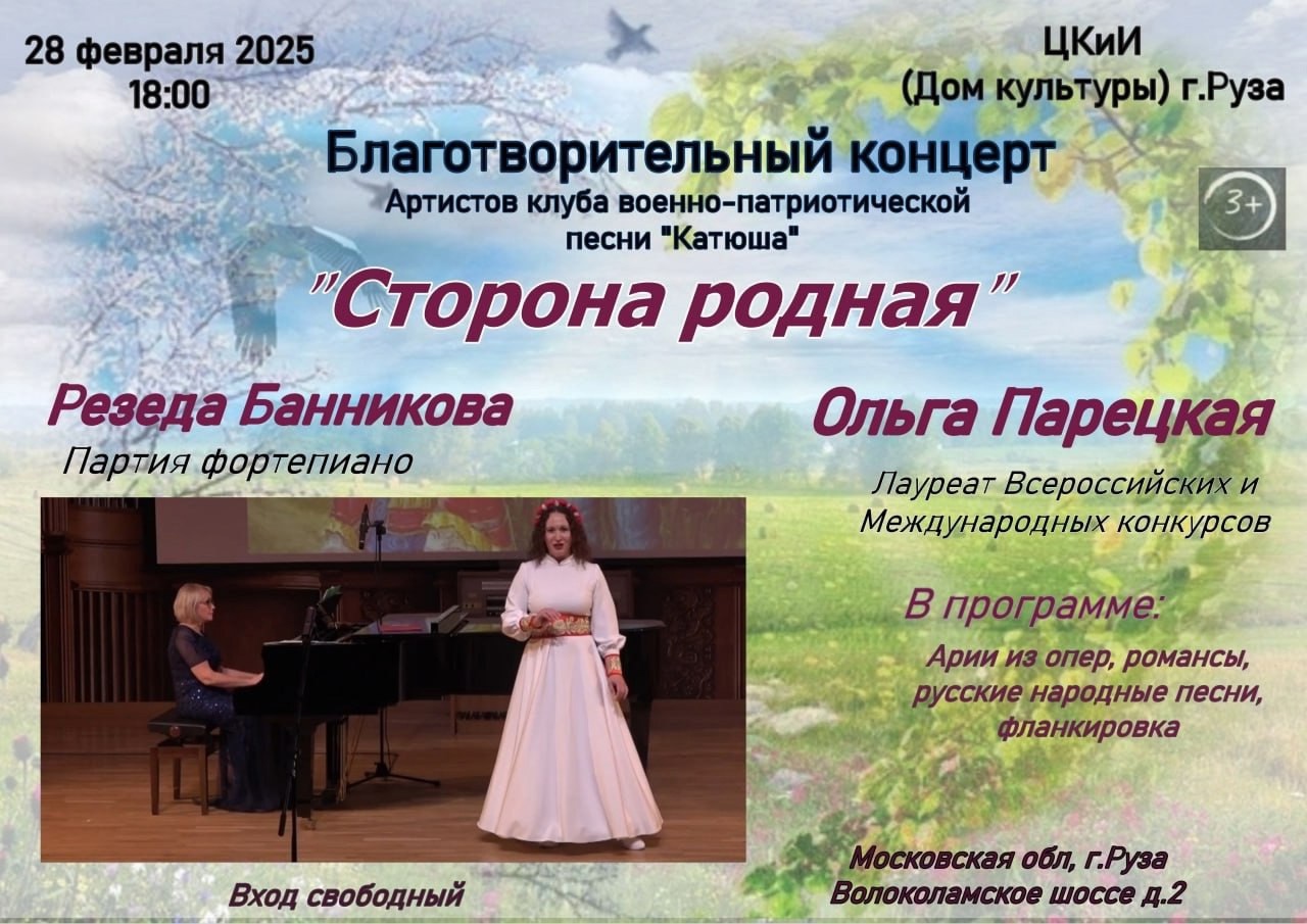 Центр культуры и искусств Рузы приглашает всех желающих на благотворительный концерт «Сторона родная» 28 февраля в 18.00. Это уникальный спектакль для зрителей всех возрастов погрузит вас в мир музыкальной сказки и замечательной, душевной музыки русских композиторов и русских народных песен. Исполнители – лауреаты Международных и Всероссийских конкурсов Ольга Парецкая – вокал, Резеда Банникова - фортепиано.