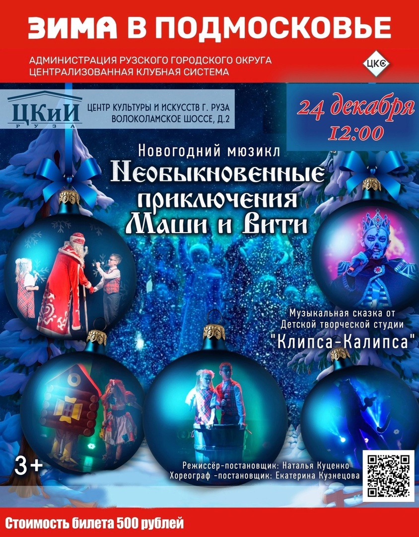 Центр культуры и искусств Рузы приглашает 24 декабря в 12:00 на новогодний мюзикл «Необыкновенные приключения Маши и Вити» от детской творческой студии «Клипса-Калипса».