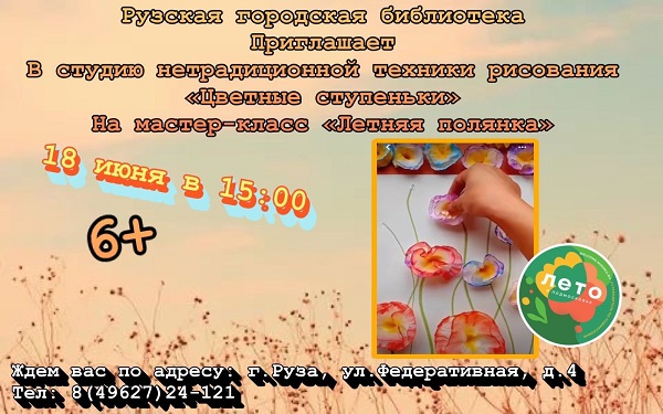 Мастер-класс «Летняя полянка» состоится 18 июня в 15 часов в студии нетрадиционной техники рисования «Цветные ступеньки» Рузской городской библиотеки.