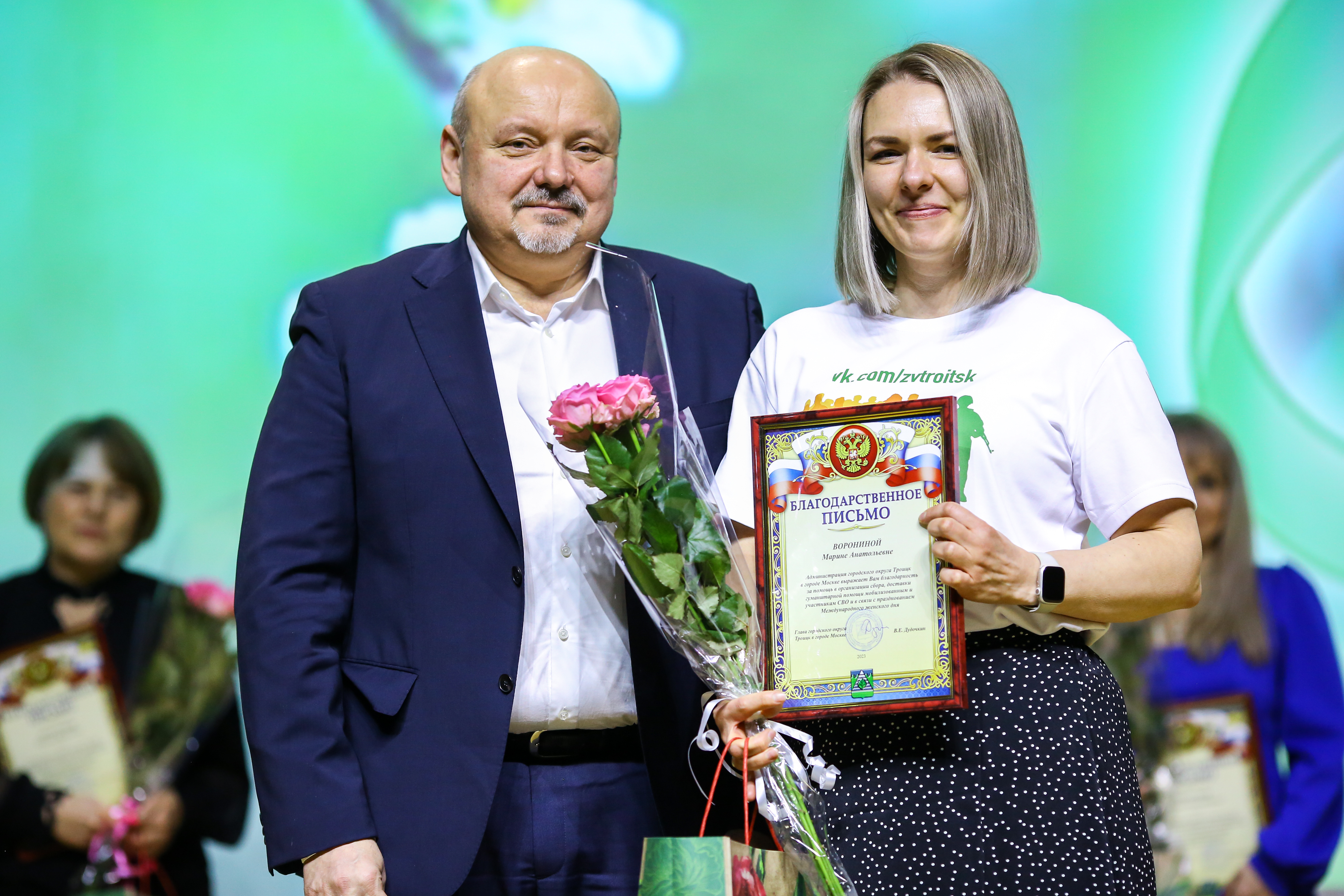 На сцене ДШИ им. Глинки танцы и песни исполнили юные и взрослые артисты. На этом подарки для прекрасной половины Троицка не закончились, глава города Владимир Дудочкин приготовил поздравления и награды для учителей, врачей, волонтёров… Всего в этот вечер грамоты и благодарственные письма получили 30 человек.