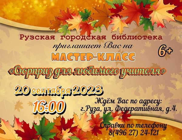 Рузская городская библиотека приглашает детей от 6 лет на мастер-класс «Сюрприз для любимого учителя», который состоится 20 сентября в 16 часов.